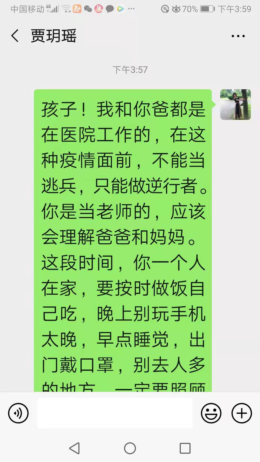 “姑娘!不知道什么時(shí)候我和你爸才能回家。你爸從年前1月22號開(kāi)始,頂著(zhù)前一天失去親人的痛苦投入了這場(chǎng)疫情的戰頭中,24號(大年三十)去武漢運防護用品差點(diǎn)被扣住,一直到深夜才回家。你爸要保證全院防護用品的供應,我們家的車(chē)每天要出外拖貨無(wú)數次,還要為礦建醫院,鐵礦醫院(四醫院發(fā)熱病房)運送藥品,醫療用品,防護用品,29號晚上你爸和醫院同事將礦建醫院發(fā)熱病人轉運到鐵礦醫院,一直到晚上九點(diǎn)都沒(méi)吃飯。接著(zhù)又去庫房清點(diǎn)庫存的防護用品(口罩,帽子,手套,防護服,?離服等)一直到深夜十二點(diǎn),只能買(mǎi)泡面充饑。每天晚上拖貨回來(lái)到七八點(diǎn),再去清點(diǎn)庫存,天天如此,每天晚上都是忙到十一二點(diǎn)。還有醫院的消毒設施,水電消防安全等你爸也要管,由于后勤收醫用療垃圾的一個(gè)員工年前去了武漢回不來(lái),每天早上你爸又要去幫忙轉運礦建醫院發(fā)熱病房的感染垃圾,一天要工作十幾個(gè)小時(shí)。關(guān)鍵是你爸不是學(xué)醫的,他不懂隔離和防護,加上醫院物質(zhì)緊缺,他又節約,經(jīng)常沒(méi)穿?離服,沒(méi)戴手套就去轉運這些發(fā)熱病人和轉運發(fā)熱病人的感染垃圾,媽媽有時(shí)看到這種場(chǎng)景,嚇得哭。