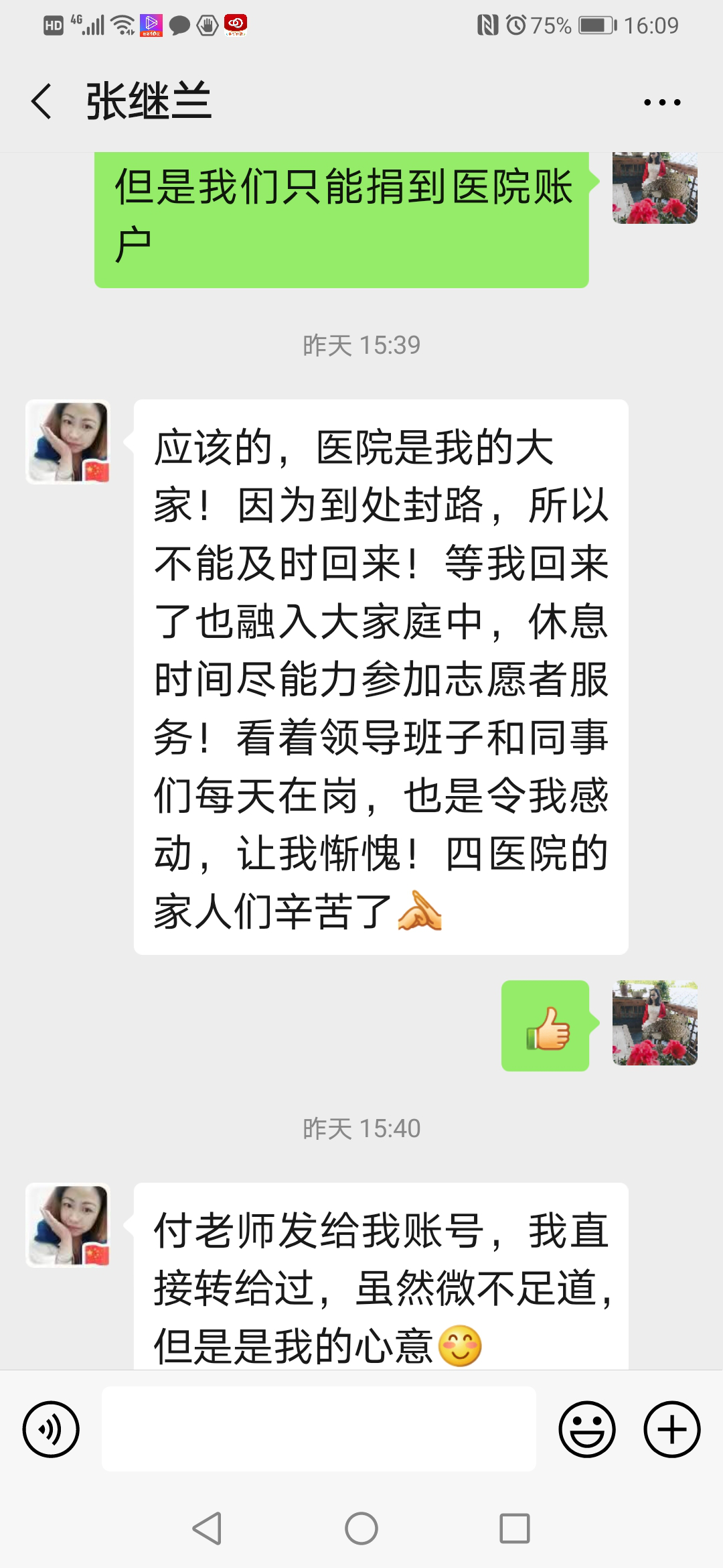 “這是我個(gè)人的心意,因為醫院防護用品都不夠用,我的捐款雖然很少很少,但是心里能安慰一點(diǎn)點(diǎn)。醫院是我的大家,因為到處封路,不能及時(shí)回來(lái),我很著(zhù)急,盼望能盡快回來(lái)與大家并肩作戰。每每看著(zhù)領(lǐng)導班子和同事們日夜奮戰,令我感動(dòng),更讓我慚愧。四醫院的家人們辛苦了!”張繼蘭如是說(shuō)。