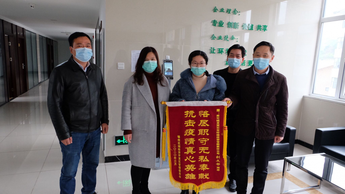 2020年3月31日上午,鄂州花湖經(jīng)濟開(kāi)發(fā)區管理委員會(huì )工作人員專(zhuān)程來(lái)到環(huán)投公司,將寫(xiě)著(zhù)“恪盡職守無(wú)私奉獻、抗擊疫情真心英雄”的感謝錦旗送到公司財務(wù)融資部劉文靜手中,感謝她在疫情期間對花湖鎮站前社區疫情防控工作做出的貢獻。