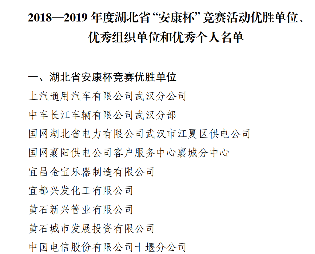 湖北省“安康杯”競賽由湖北省總工會(huì )、湖北省應急管理廳聯(lián)合主辦?!鞍部当备傎惪己藰藴室罁餍袠I(yè)的安全生產(chǎn)管理特點(diǎn)、傷亡事故和職業(yè)病控制水平等綜合因素制定,通過(guò)競賽考核參賽企業(yè)的安全生產(chǎn)管理、領(lǐng)導者安全生產(chǎn)意識、職工安全生產(chǎn)知識水平和能力、安全生產(chǎn)等各項指標。2018—2019年度共評出58個(gè)優(yōu)勝單位、30個(gè)優(yōu)秀組織單位、40名優(yōu)秀個(gè)人。