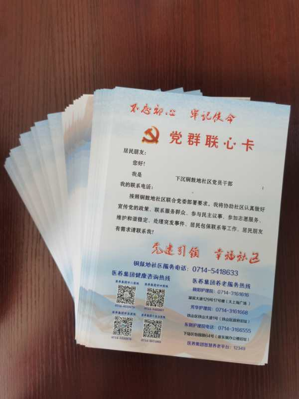 李京鶴表示,此次發(fā)放“黨群聯(lián)心卡”是下沉黨員干部入戶(hù)宣傳的一種有效措施。鄂東醫養集團聯(lián)系社區工作隊精心制作的“黨群聯(lián)心卡”,靈活解讀下沉社區工作任務(wù),讓居民更深入了解政策,建立起便捷的溝通橋梁,有利于更好發(fā)揮網(wǎng)格化管理作用,在居民需要幫助的時(shí)候能夠及時(shí)聯(lián)系到社區下沉黨員干部。同時(shí),結合醫養集團醫療養老資源優(yōu)勢和社區老年群體較多的特點(diǎn),將醫養集團各直屬醫院、養老服務(wù)機構健康熱線(xiàn)進(jìn)行了公布,用心用情提升入戶(hù)結對成效。
