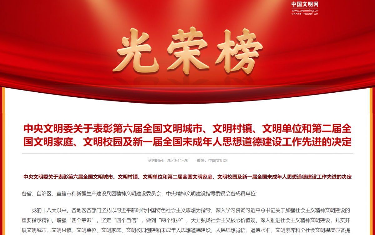 11月20日,《中央文明委關(guān)于表彰第六屆全國文明城市、文明村鎮、文明單位和第二屆全國文明家庭、文明校園及新一屆全國未成年人思想道德建設工作先進(jìn)的決定》正式公布。黃石市自來(lái)水有限公司被授予“全國文明單位”榮譽(yù)稱(chēng)號。